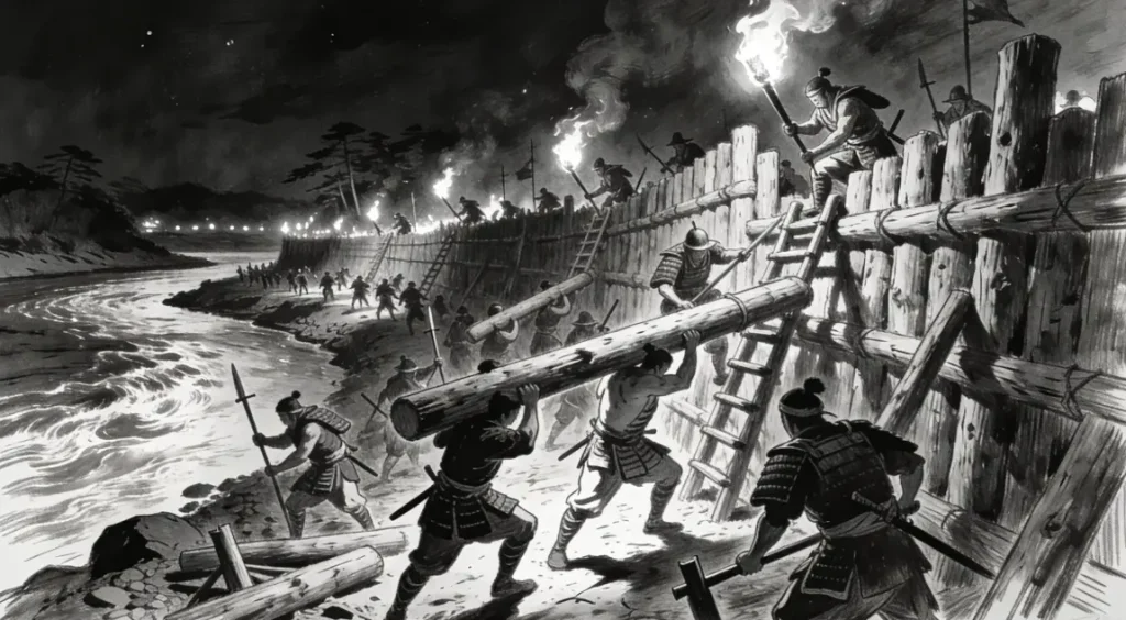 4. 材木をあらかじめ組み上げておき、川を使って運ぶなどの工夫で、短期間のうちに砦を完成させた。